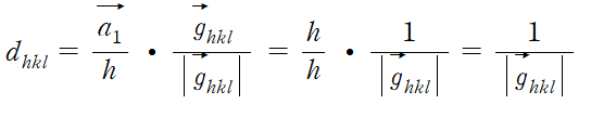 ⓐ에서 g 벡터가 (hkl)의 법선 벡터임을 확인했습니다. 선분 OH의 길이인 d는 선분 OA에 OH 방향의 단위벡터를 내적해서 구할 수 있습니다.