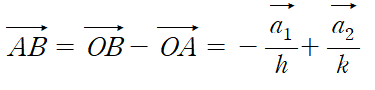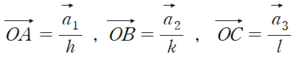 점 A,B,C로 이루어진 평면을 (hkl)이라고 하겠습니다. 밀러 지수의 정의를 역으로 이용해 OA 벡터, OB 벡터, OC 벡터를 알아냈습니다. 밀러 지수를 활용하면 x축과의 교점 A의 좌표는 (a/h,0,0)입니다. 기저 벡터 a_{1} 의 크기가 a임을 활용해서 각각의 벡터를 아래에 나타냈습니다.