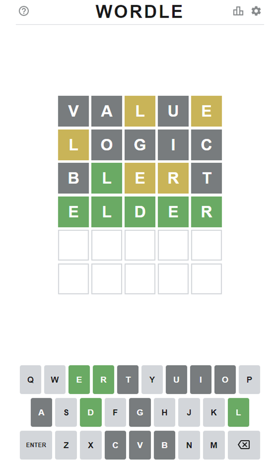 - 단어에 없는 철자는 회색, 단어에 포함되지만 위치가 다르면 노란색, 단어에 포함되면서 위치까지 맞으면 초록색으로 표시됩니다.