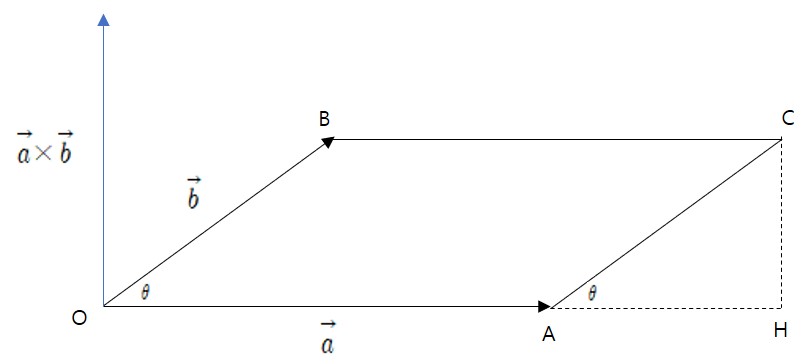 위 사진은 평행 육면체의 밑면만을 그린 그림입니다. 사각형 OACB의 넓이는 밑변 * 높이로 구할 수 있습니다. OA의 길이는 벡터 a의 크기와 같습니다. 또 CH의 길이는 벡터 b의 크기에 sinθ를 곱한 값과 같습니다. 즉, 사각형 OACB의 넓이는 a벡터와 b벡터의 외적값과 같습니다.