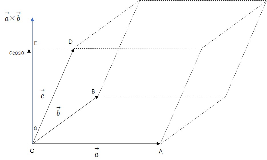 이제 평행 육면체의 높이를 구해봅시다. c 벡터와 z축이 이루는 각도를 α라고 하겠습니다. 이때 평행 육면체의 높이에 해당하는 OE의 길이는 c 벡터의 크기에 cos α를 곱한 값입니다. 즉, 평행 육면체의 부피는 벡터 a와 벡터 b의 외적에 벡터 c를 내적해서 구할 수 있습니다.