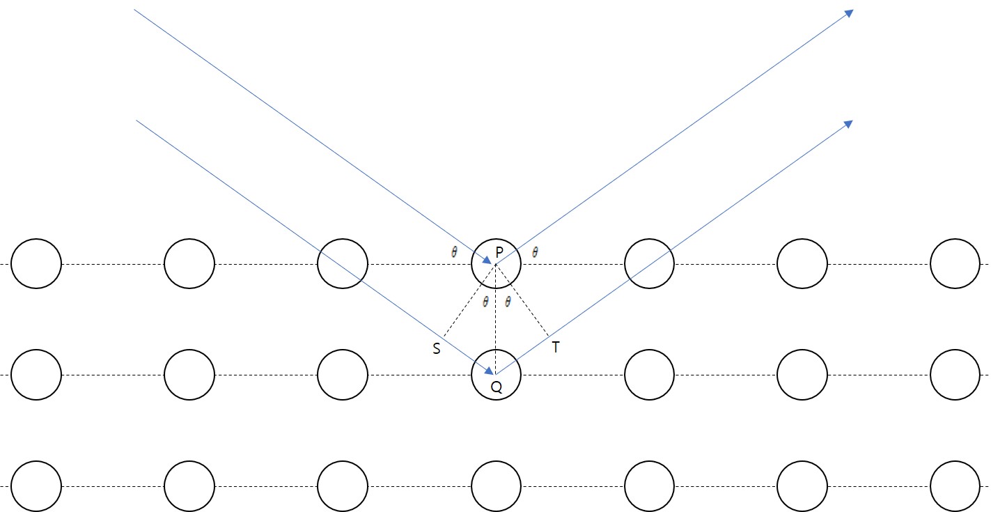 보강 간섭이 일어나기 위해서는 위상 차이가 파장의 정수배(nλ)여야 합니다. 두 X선의 경로차는 SQ + QT입니다. 만약 이 SQ + QT의 값이 nλ 이라면 보강 간섭이 일어나는 것이죠. X선과 평면이 이루는 각의 크기가 θ, PQ사이의 거리를 d라고 했을 때 SQ=QT=d sin θ입니다.
