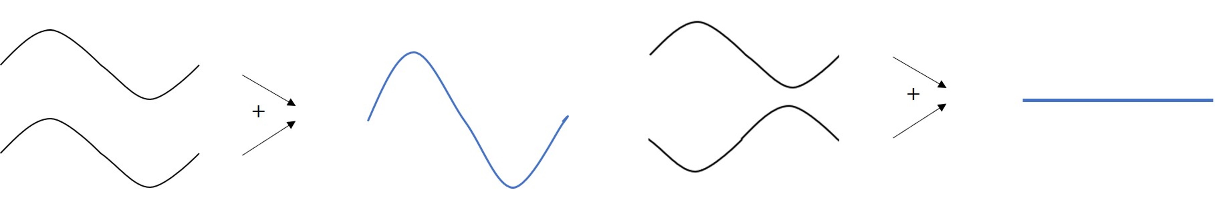 서로 다른 파동들은 서로 합쳐져서 새로운 하나의 파동이 됩니다. 만약 위상이 정확히 같은 2개의 파동이 합쳐진다면 파장은 같고 진폭이 2배인 파동이 되는 것이죠. 이런 경우를 보강 간섭이라고 합니다. 반대로 파동의 위상이 정확히 반 파장 정도 차이가 난다면 일자 모양이 됩니다. 이런 경우를 상쇄 간섭이라고 합니다.
