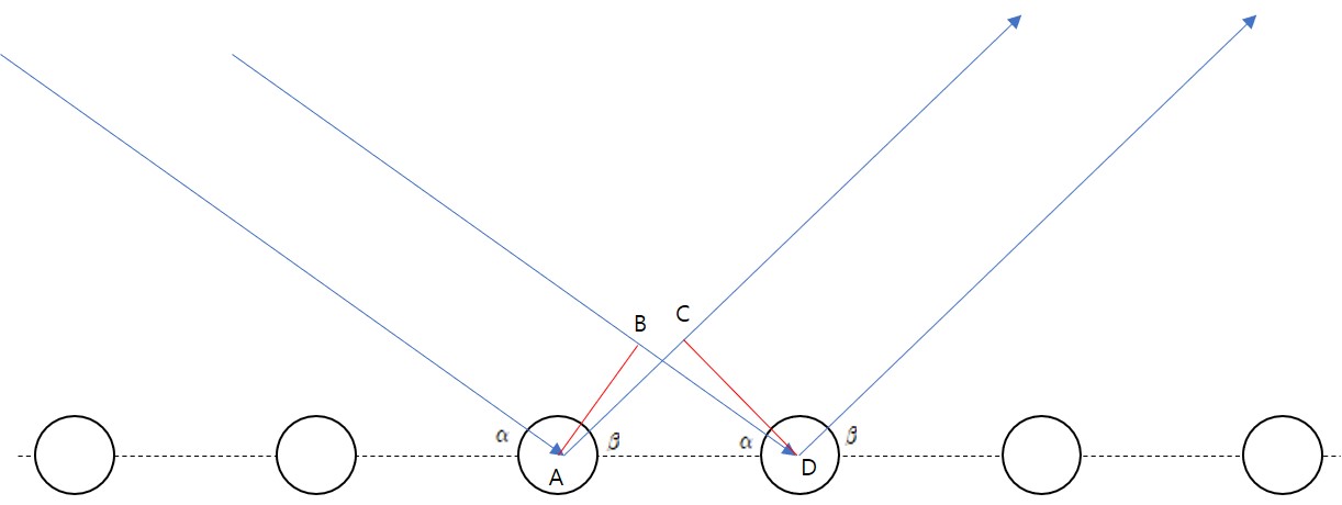 입사각의 크기를 α, 반사각의 크기를 β, AD의 길이를 d라고 가정하겠습니다. 그렇다면 점 A와 점 D에서 수선을 내려서 경로차를 확인해보겠습니다. 그 결과 두 X선 사이의 경로차가 BD - AC임을 알 수 있습니다.