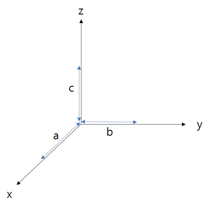 단위정을 수치로 잘 표현하기 위해서 변의 길이인 a,b,c와 각도 α,β,γ 가 나옵니다. x축 방향에 해당하는 변의 길이가 a, y축 방향에 해당하는 변의 길이가 b, z축 방향에 해당하는 변의 길이가 c입니다. 마찬가지로 y축과 z축 사이의 각도가 α, x축과 z축 사이의 각도가 β, x축과 y축 사이의 각도가 γ입니다.