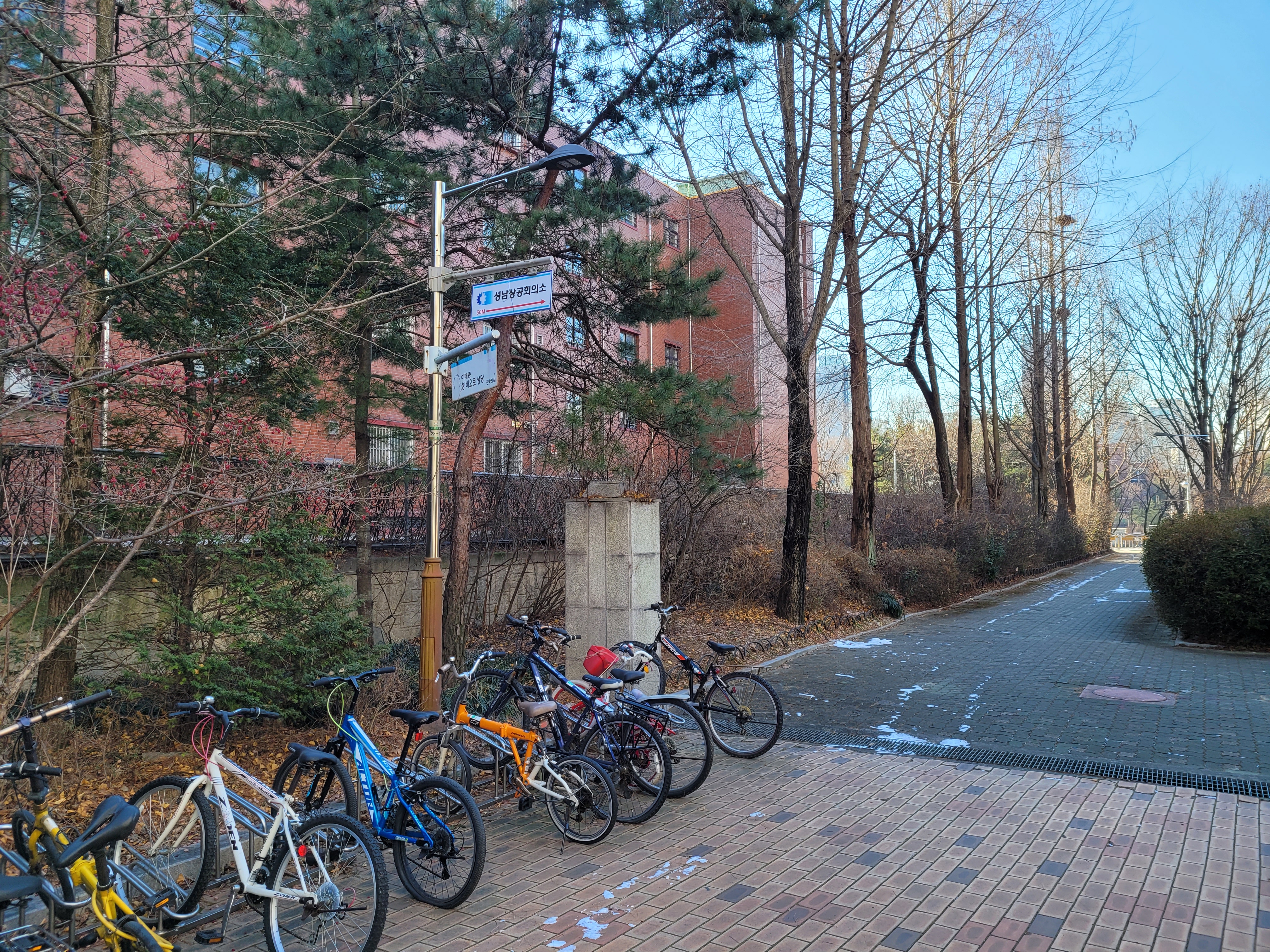 계속 직진하다보면 자전거 거치대 근처에 있는 가로등을 볼 수 있다. 이 지점에서 우회전해야 한다.