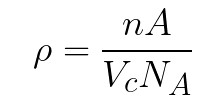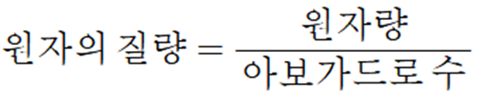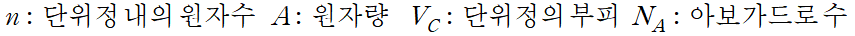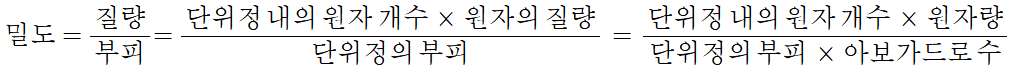또 (2)결정 구조 안에 들어 있는 원자의 개수는 질량을 구하는 것에 큰 역할을 합니다. 단순 입방 구조처럼 단위정 안에 질량이 M인 원자가 1개 있다면 단위정의 질량이 M이 됩니다. 면심 입방 구조처럼 단위정 안에 질량이 M인 원자가 4개가 있다면 단위정의 질량이 4M이 되는 것이죠. 즉, 결정 구조와 원자량을 안다면 단위정의 질량까지 구할 수 있습니다. 지금까지 다룬 내용을 수식으로 만들겠습니다.