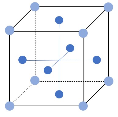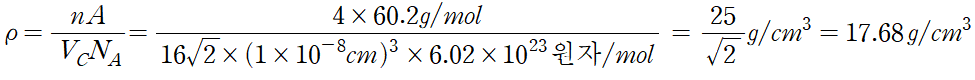 가상의 원소 X의 결정 구조는 FCC이며 원자 반지름은 0.1nm, 원자량은 60.2g/mol 이라고 하겠습니다. 이 때 밀도를 구해보겠습니다.