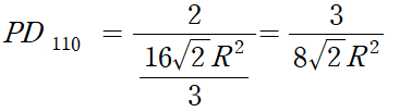 오른쪽 그림은 면심 입방 구조의 (001)평면입니다. 이때 [110]방향의 선밀도를 구해보겠습니다. 이 때 벡터의 길이는 4R, 벡터에 중심이 있는 원자의 개수는 2개입니다.