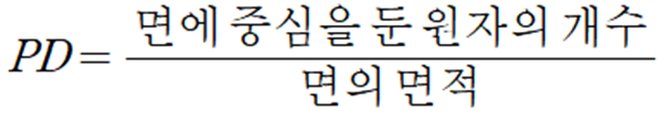 면밀도의 정의는 특정면의 단위 면적당 특정면에 중심을 둔 원자의 개수입니다. 이를 수식으로 표현하면 다음과 같습니다.